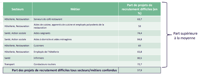 Dans le classement de Pôle emploi établi par métier (tableau ci-dessous), les difficultés de recrutement les plus fortes touchent les aides à domicile (85% de recrutements sont jugés difficiles), les infirmiers (80%), les conducteurs routiers (73%), des employés de l'hôtellerie (66%), etc. Des métiers où, soit dit en passant, les conditions de travail, les horaires et la charge de travail sont souvent jugés difficiles et la rémunération insuffisante.